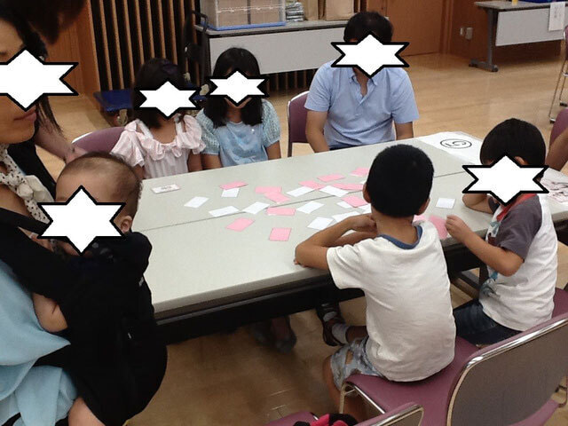 別に準備したカードには備品の絵が描いてあり、その上に重ね、一番早くそろった列を選んでいた子が優勝!「神山布あそび」さんとの協働製作。